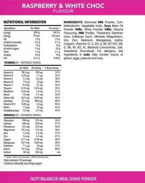 Skimmed Milk Powder, Maltodextrin, Inulin, Soya Bean Oil Powder (Milk), Natural Flavouring, Milk Protein, Thickeners (Xanthan Gum, Sodium Carboxy Methyl Cellulose), Vitamin & Mineral Blend (Magnesium Oxide, Vitamin C, Vitamin E, Iron Pyrophosphate, Zinc Sulphate, Niacin, Vitamin A, Pantothenic Acid, Biotin, Manganese Sulphate, Vitamin B12, Potassium Iodide, Sodium Selenite, Folic Acid, Vitamin D, Copper Sulphate, Vitamin B6, Thiamine, Riboflavin, Vitamin K), Colour (Beetroot Red), Salt, Sweetener (Sucralose)